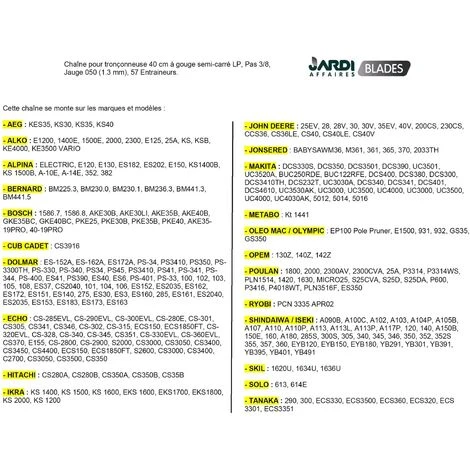 ChaĂ®ne Professionnelle 40cm pour tronçonneuse, Pas 3/8, Jauge 050/1,3mm, 57 Entraineurs. Correspondance Oregon 91-57E. Cette chaĂ®ne pour tronçonneuse de 40 cm se monte sur les marques Dolmar, Echo, Makita, Shindaiwa, Tanaka, solo, Skil, Ryobi, Poulan, Opem, Oleo Mac, Metabo, Jonsered, John Deere, Ikra, Hitachi, Cub Cadet, Bosch, Bernard, Alko, Alpina et AEG. Voir tableau d’affectation par marque et modèle en photo ou nous contacter pour vĂ©rifier votre modèle.