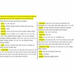 ChaĂ®ne Professionnelle 42, 43 ou 45 cm (suivant guide et nombre de dents du pignon) pour tronçonneuse, Pas 3/8, jauge 058/1,5mm, 64 Entraineurs. Correspondance Oregon 73-64E. Cette chaĂ®ne pour tronçonneuse de 42, 43 ou 45 cm se monte sur Dolmar, Husqvarna, Jonsered, Partner, Iseki, Shindaiwa, Solo, Zenoah, Taiga, Opem, Oleo Mac, Nautac, Makita, Echo, Castor, Castel, Alpina et Alko. Autres marques ou modèles nous contacter. Voir tableau d’affectation par marque et modèle en photo ou nous contacter pour vĂ©rifier avant commande.