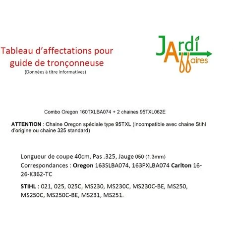 Ensemble Oregon comprenant 1 guide professionnel 40cm de coupe 160TXLBA074 + 2 chaines 95TXL062E Pas 325, Jauge 1,3mm avec 62 maillons entraineurs. Cet ensemble offre un rapport qualitĂ© prix très avantageux. Cet ensemble se monte essentiellement sur les marques Stihl, Logosol et AEG. Cet ensemble peut se monter Ă la place de 163SLBA074 ou 163PXLBA074 (ATTENTION Jauge des chaines diffĂ©rentes et chaine 95 incompatible avec chaine 325 standard) ATTENTION : Merci de respecter notre tableau d’affectation en photo sur la fiche produit ou de nous contacter pour vĂ©rifier votre montage.
