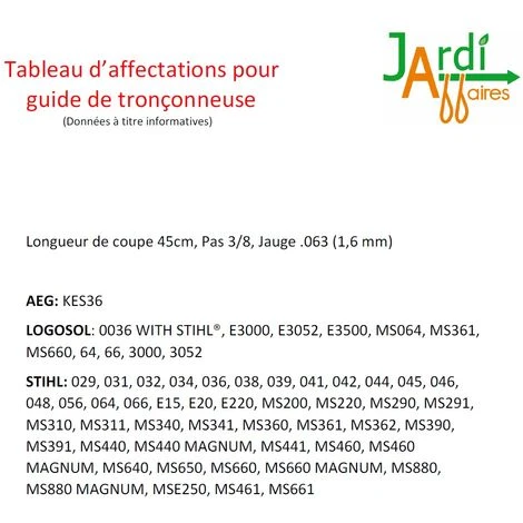 Ensemble Oregon comprenant 1 guide professionnel 45cm de coupe 183SFHD025 + 2 chaines 75DPX066E Pas 3/8, Jauge 1,6mm avec 66 maillons entraineurs. Cet ensemble offre un rapport qualitĂ© prix très avantageux et permet aux utilisateurs d’accĂ©der Ă la qualitĂ© des produits Oregon Ă un prix très compĂ©titif. Cet ensemble se monte essentiellement sur les marques Stihl, Logosol et AEG. Merci de respecter notre tableau d’affectation en photo sur la fiche produit ou de nous contacter pour vĂ©rifier votre montage.