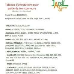 Guide pour tronçonneuse Ă©lagueuse longueur de coupe de 25cm Pas 3/8LP, Jauge 1,3mm (050) livrĂ© avec 1 chaine 40 maillons entraineurs (dents qui entrent dans le guide). Ce guide et cette chaine semi-professionnel se monte principalement sur les tronçonneuses Dolmar, Echo, Eckman, Efco, Florale Meilleur (Florbest), Husqvarna, Max Bahr, Ryobi et Zenoah. ATTENTION : Merci de respecter notre tableau d’affectation par modèle ou de nous contacter avant de commander un guide qui pourrait ne pas convenir Ă votre tronçonneuse car il existe des centaines de montages diffĂ©rents au niveau des fixations.