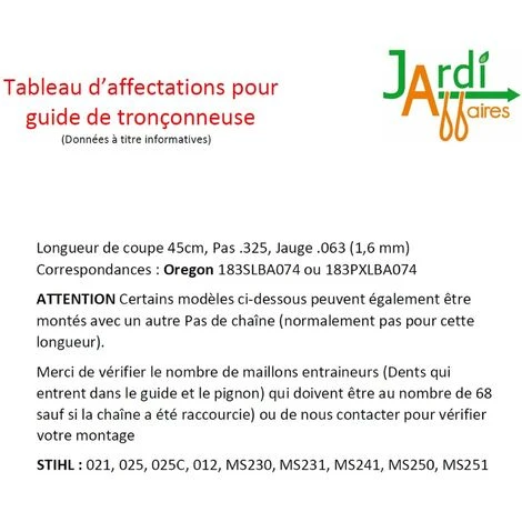 Ensemble guide avec chaĂ®ne pour tronçonneuse professionnel longueur 45cm 68 entraineurs pas 3.25 jauge 0.63 (1.6mm) remplace les guides Oregon 183SLBA074 ou 183PXLBA074 et la chaine 22-68E, ce guide et cette chaĂ®ne se monte uniquement sur les tronçonneuses Stihl 021, 23, 025, 012, MS230, MS231, MS250, MS251. Voir tableau d’affectation en photo. Guide seul disponible ou en Combo 4 chaĂ®nes 68 maillons entraineurs.