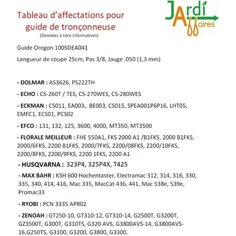 Guide Oregon 100SDEA041 longueur de coupe de 25cm Pas 3/8LP, Jauge 1,3mm (050) pour tronçonneuse Ă©lagueuse. Ce guide Oregon se monte principalement sur les tronçonneuses Dolmar, Echo, Eckman, Efco, Florale Meilleur, Husqvarna, Max Bahr, Ryobi et Zenoah. Merci de respecter notre tableau d’affectation par modèle ou de nous contacter avant de commander un guide qui pourrait ne pas convenir Ă votre tronçonneuse car il existe des centaines de montages diffĂ©rents au niveau des fixations.