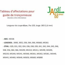 Guide Oregon 243SFHD025 pour tronçonneuse, Pas 3/8, Jauge 1.6mm (063), longueur de coupe 60cm. Ce guide est gĂ©nĂ©ralement montĂ© avec une chaine de 84 maillons entraineurs (dents qui entrent dans le guide) et Ă©quipe principalement les tronçonneuses de marque AEG, Stihl ou Logosol. ATTENTION : Merci de respecter notre tableau d’affectation en photo sur la fiche produit pour les marques et modèles et de vous assurer du Pas de chaine de votre tronçonneuse ainsi que du nombre de maillons entraineurs avant de passer commande.
