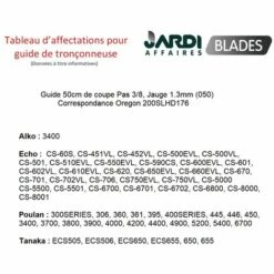 Guide Ozaki pour tronçonneuse, longueur de coupe 50cm, Pas 3/8, Jauge 1.3mm (050) montĂ© gĂ©nĂ©ralement avec chaine de 70 maillons. Ce guide remplace la rĂ©fĂ©rence Oregon 180SLHD176 et se monte sur les marques de tronçonneuse Alko, Echo, Poulan et Tanaka (voir tableau d’affectation des modèles en photo). Guide Ă©galement vendu avec 1 ou plusieurs chaines Ă un tarif avantageux. ATTENTION : Merci de respecter nos affectations (tableau en photo sur la fiche produit) et de vous assurer du Pas (3/8) et de la Jauge (1.3mm) de votre montage d’origine (plusieurs montages possibles pour les modèles de tronçonneuse citĂ©s)