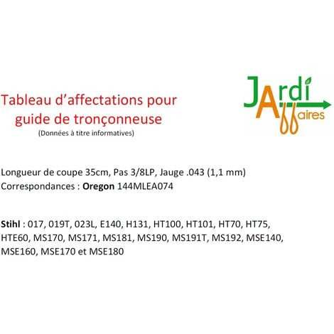 Guide Ozaki 35cm de coupe Pas 3/8LP, Jauge 043/1,1mm pour tronçonneuse Stihl modèles 017, 019T, 023L, E140, H131, HT100, HT101, HT70, HT75, HTE60, MS170, MS171, MS181, MS190, MS191T, MS192, MSE140, MSE160, MSE170 et MSE180 Correspondances Oregon 144MLEA074. ATTENTION : Le mĂŞme modèle existe mais pour chaine Jauge 1.3mm (Ă©paisseur des dents d’entrainement), bien vĂ©rifier votre chaĂ®ne avant de commander Ce guide de 35cm est Ă©galement proposĂ© avec une chaine de 50 maillons entraineurs ou en Combo avec 4 chaines. Merci de vous rĂ©fĂ©rer au tableau d’affectation par marques et modèles de tronçonneuse afin de ne pas commettre d’erreur.