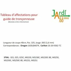Guide semi-professionnel pour tronçonneuse longueur de coupe 40cm Pas .325 Jauge 0.63 (1.6mm) correspondances Oregon 163SLBA074, 163PXLBA074, Carlton 16-26-K362-TC. Ce guide pour tronçonneuse se monte uniquement sur les machines de la marque STIHL. ATTENTION : Merci de respecter notre tableau d’affectation des modèles en photo, pour les modèles indiquĂ©s montage en 3/8LP ou 325 merci de vous assurer du Pas de chaine de votre pignon. Modèle Ă©galement disponible en Combo (1 guide + 4 chaines 62 maillons entraineurs) ou 1 guide + 1 chaine 62 maillons entraineurs.