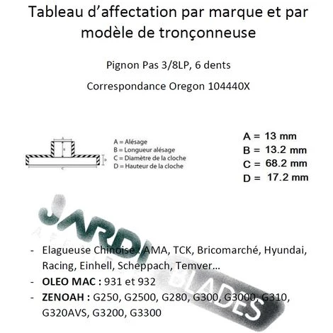Pignon Professionnel pour tronçonneuse Zenoah, Oleo Mac et Ă©lagueuse 25cc de fabrication Chinoise (AMA, TCK, BricomarchĂ©, Hyundai, Racing, Einhell, Scheppach, Temver…). Entrainement Ă 6 dents, Pas 3/8LP. Ce pignon peut remplacer la rĂ©fĂ©rence Oregon 104440X et se monte uniquement sur les marques Zenoah et Oleo Mac, il remplace la pièce d’origine sans modification. ATTENTION : Merci de respecter notre tableau d’affectation en photo sur la fiche produit et de vĂ©rifier vos dimensions avant de commander.