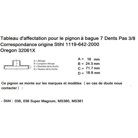 Pignon Professionnel pour tronçonneuse Stihl, entrainement Ă 7 Dents, Pas de chaĂ®ne 3/8 063 (1,6 mm). Correspondance Oregon 32061X, origine Stihl 1119-642-2000. Ce pignon pour tronçonneuse Stihl se monte en lieu et place du modèle d’origine sans aucune modification. Voir notre tableau d’affectation en photo ou nous contacter.