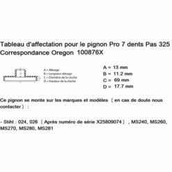 Pignon Professionnel avec pignon pour tronçonneuse Stihl, entrainement Ă 7 Dents, Pas 325. Ce pignon peut remplacer la rĂ©fĂ©rence Oregon 100876X et se monte uniquement sur les tronçonneuses Stihl 024, 026, MS240, MS260, MS 270, MS280 et MS 281. VĂ©rifier notre tableau d’affectation en photo ou nous contacter.
