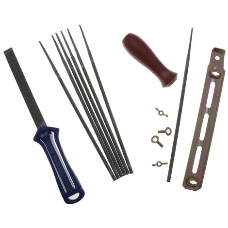 Kit limes pour affutage de tronçonneuse au pas de 325 comprenant un porte lime avec lime ronde diamètre 4,8 mm (3/16ème de pouce) manche en bois et rĂ©glette avec angles d’affutage, 6 limes rondes diamètre 4,8mm (3/16ème de pouce) longueur 200 mm, 1 lime plate Ă rabots avec manche en plastique auto-verrouillable. Cet ensemble professionnel permet d’affuter les chaĂ®nes au pas de 325 avec une grande prĂ©cision.