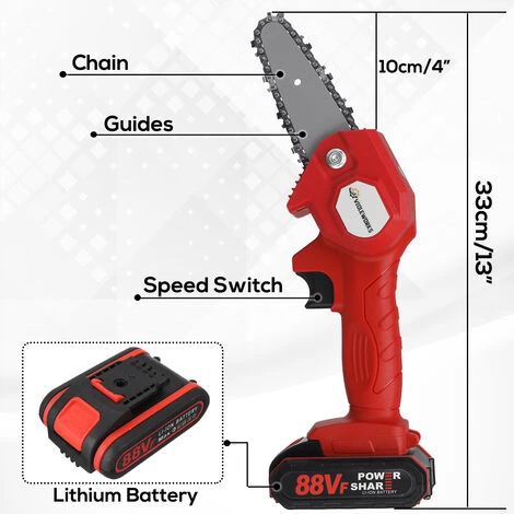 – Commande Ă une main : petite taille, peut ĂŞtre tenue d’une seule main. La mini tronçonneuse pèse environ 0,7 kg et une longueur totale de seulement 33 cm (13 pouces).
