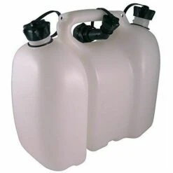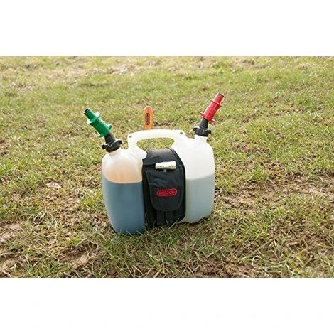 Bidon à deux compartiments pour essence et graisse de chaîne de tronçonneuses.