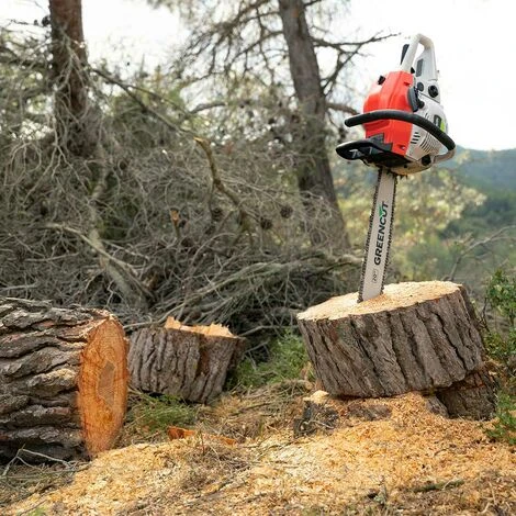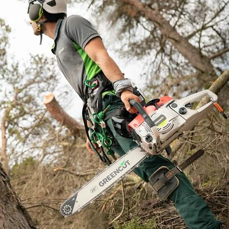 Tronçonneuse GS620X GREENCUT thermique pour abattage et Ă©lagage à moteur Ă essence avec lame de 20″, idĂ©ale pour les personnes qui ont besoin d’une scie Ă chaĂ®ne puissante et efficace pour abattre ou tailler des arbres ou tout autre type de travaux forestiers.